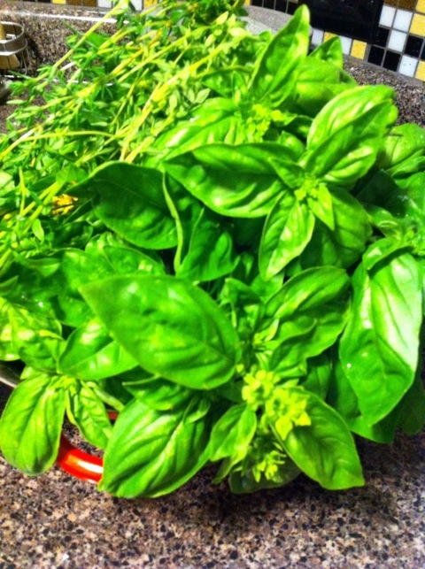 The basil I planted in April has taken off and I decided to make some pesto today to highlight this beautiful herb. I followed Alton Brown’s recipe for Pistachio and Mixed Herb Pesto except I used all basil and no parsley. The tarragon, oregano, and thyme all came from my garden as well.
