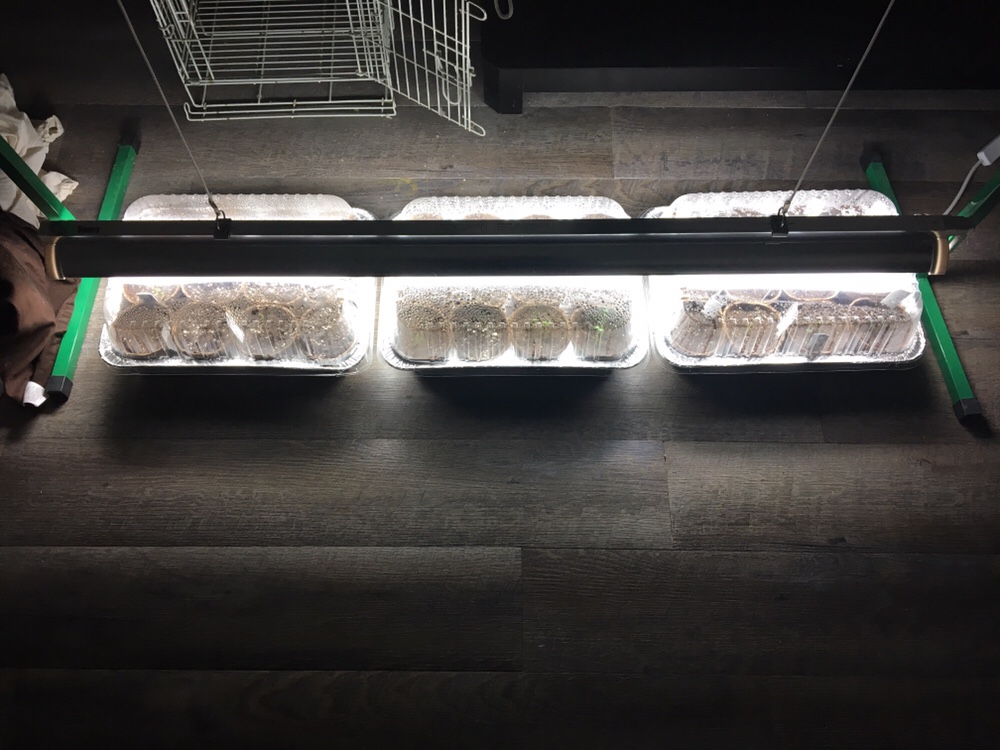 I bought some starter mix and some 3-inch peat pots. In the past, I have used expandable peat pellets with success but you need to pot them up when the seedlings get to a certain size anyway, and I just decided to skip that and went directly to the larger pots. I bought some disposable lasagna pans (they come with a nice domed plastic lid) and placed the pots in them after I watered them well and planted the seeds. Each of the pans held 12 of the 3″ peat pots pretty snugly and they are cheaper than the “greenhouse kits” you can buy for starting seedlings indoors. I adjusted the lights so that they are directly above the lid of the pans. I plan to run the lights for 24 hours. I’ve read conflicting information about the light timing, but from what I can tell there is no real consensus, so I’m sticking with 24 hours for now. The birds will not be disturbed by the light.